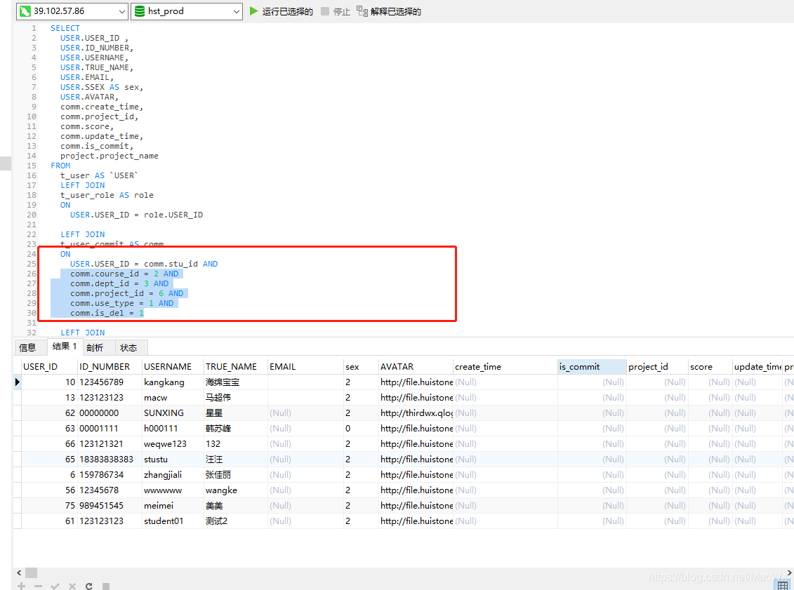 SELECT USER.USER_ID , USER.ID_NUMBER, USER.USERNAME, USER.TRUE_NAME, USER.EMAIL, USER.SSEX AS sex, USER.AVATAR, comm.create_time, comm.project_id, comm.score, comm.update_time, comm.is_commit, project.project_name FROM t_user AS `USER` LEFT JOIN t_user_role AS role ON USER.USER_ID = role.USER_ID LEFT JOIN t_user_commit AS comm ON USER.USER_ID = comm.stu_id AND comm.course_id = 2 AND comm.dept_id = 3 AND comm.project_id = 6 AND comm.use_type = 1 AND comm.is_del = 1 LEFT JOIN t_experiment_project AS project ON comm.project_id = project.project_id WHERE role.ROLE_ID = 82 AND USER.is_del = 1 AND USER.`STATUS` = 1 AND USER.DEPT_ID = 3 LIMIT 0, 10