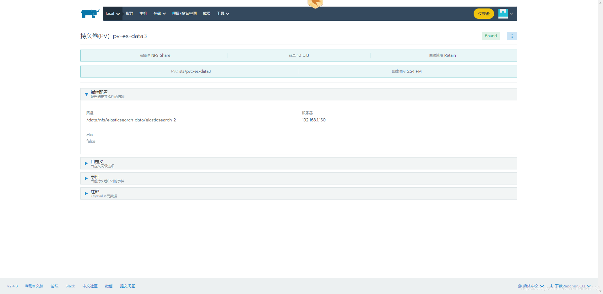 elasticserach集群,主要是配置文件和数据处理好即可。由于sts类型的pod可以通过无头svc实现之间的域名解析,所以我们可以在配置文件中把共同需要的配置写成变量,比如HOSTNAME,配置文件elasticsearch.yml文件这么做之后,就可以共享了,只做一个挂载点即可。数据是肯定不能共享了,所以做三个挂载点。我这里使用的pv是nfs类型。