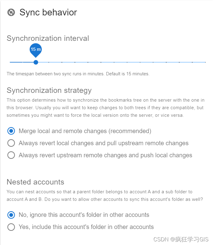 接下来,大家按照个人习惯,设定一下书签的同步频率。我这里选择了15m,就说明只要我开启Chrome浏览器,该插件就会每隔15分钟自动同步一次我们的书签。