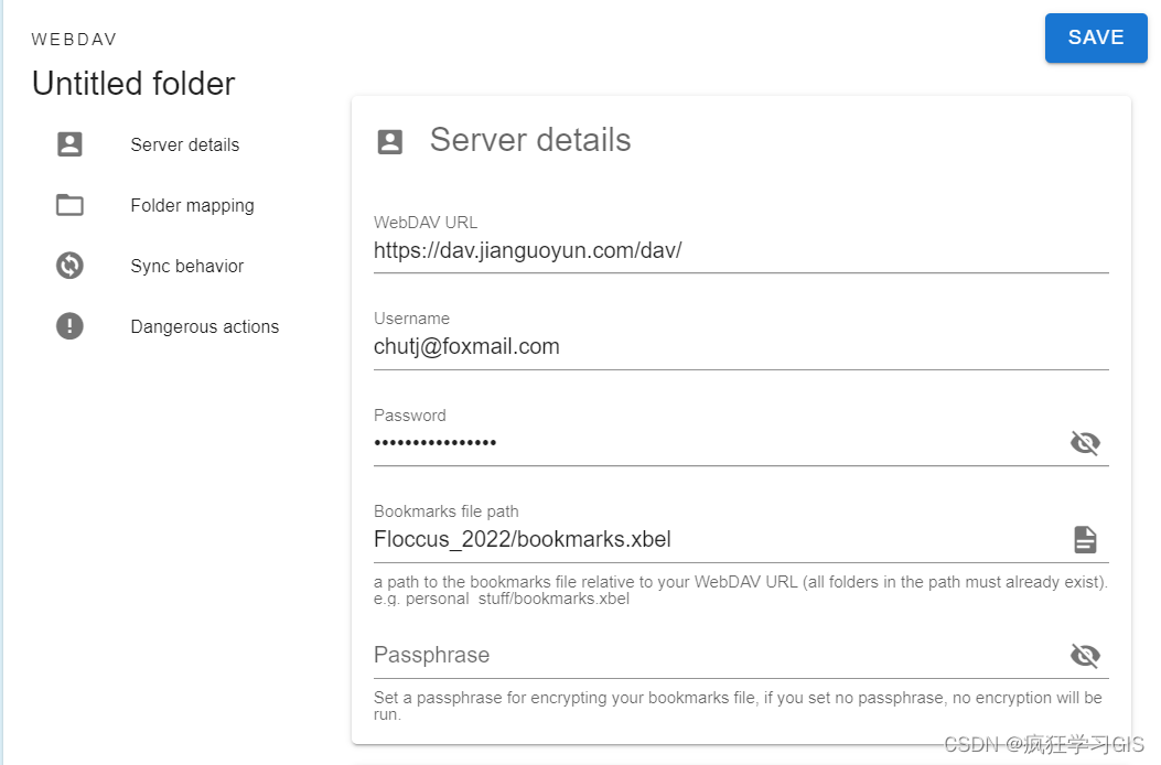 接下来,在弹出的窗口中(如下图所示),第一行与第二行分别按照前面我们提到的坚果云“第三方应用管理”处(如下下图所示)的“服务器地址”与“账户”输入即可,第三行密码输入我们坚果云前期生成的密码即可;第四行输入我们前期创建的bookmarks.xbel文件的路径;第五行密码可以设置也可以不设置,大家根据提示按照自己的需要来即可。