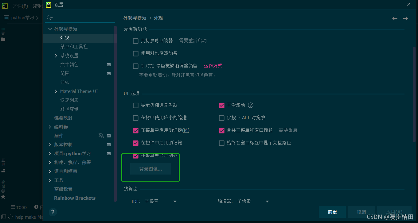这个不需要安装插件只需要几步设置即可完成,点击设置-外观与行为-外观,找到图中位置