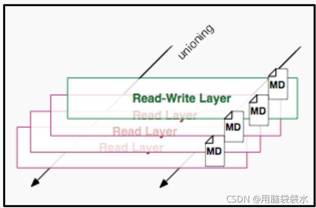 统一文件系统(union file system)技术能够将不同的层整合成一个文件系统,为这些层提供了一个统一的视角,这样就隐藏了多层的存在,在 用户 的角度看来,只存在一个文件系统(就相当于以一种俯瞰的视角看左边的多个层)。即右图形式。