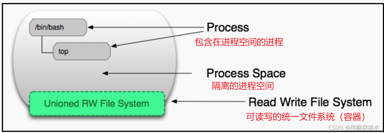 一个运行态容器(running container)被定义为一个可读写的统一文件系统 + 隔离的进程空间 和 包含其中的进程。