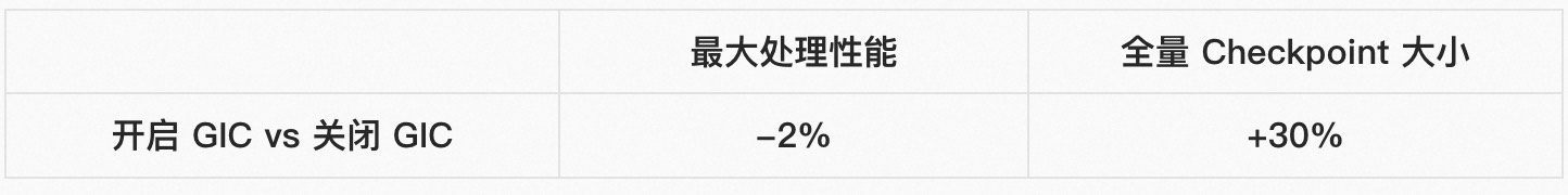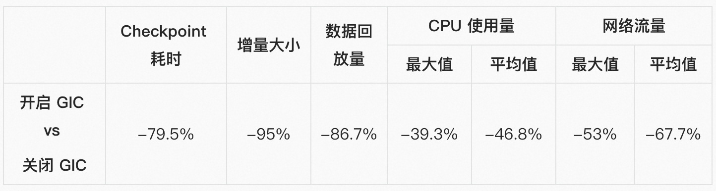 通用增量 Checkpoint(Generic Incremental Checkpont,简称 GIC)旨在提高 Checkpoint 过程的速度和稳定性。WordCount 案例中的一些实验结果如下所示。 请参考这篇 性能测评文章 获取更多详细信息,该文结合理论分析和实践结果展示了 GIC 的收益和成本。