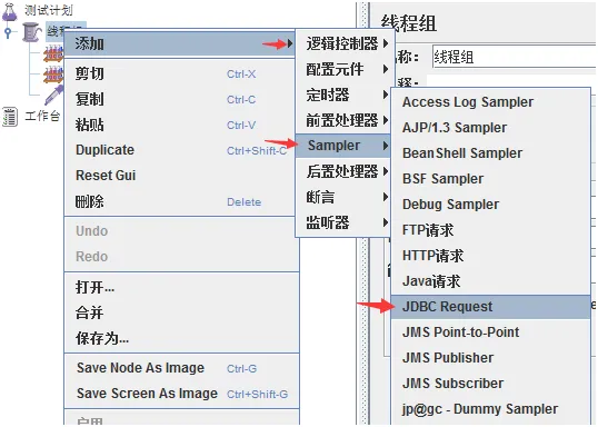 右键线程组->添加->Sampler->JDBC Request