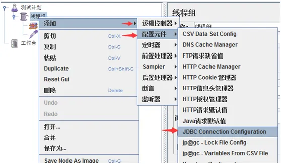 右键线程组->添加->配置元件->JDBC Connection Configuration