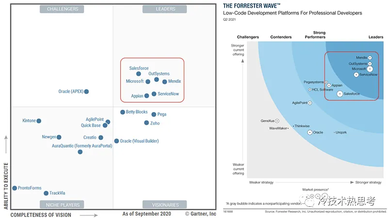 低代码专指低代码应用开发平台(LCAP),是一个被业界广泛认可的概念,头部的分析机构如Forrester和Gartner都已经发布了多年低代码开发平台的报告。如下图所示,大家可以看到这两家的报告入选的产品都很接近,特别是头部的六家简直是一模一样。这说明低代码应用开发平台已经是一个比较成熟的市场。