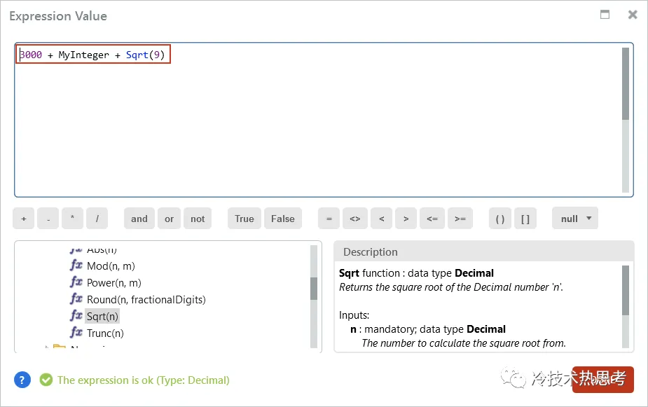 表达式语言有些类似Excel里的公式,有表达式语言才可以做一些比较复杂的计算。下图是OutSystems的表达式编辑器,大家可以看到有各种操作符,还有很多内置函数,比如数学函数、字符串处理函数等。