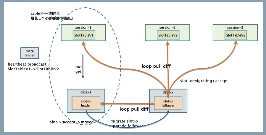 - session/data 同时通过心跳获取最新的 slotTable,避免 meta 通知失效的风险。