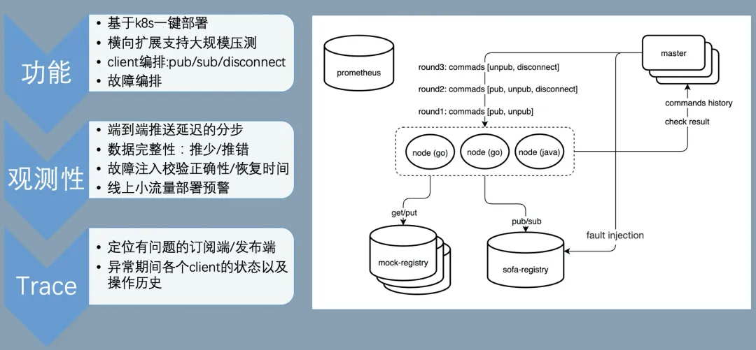 针对该系列问题,我们开发了 SOFARegistryChaos,特别针对最终一致性提供完备的测试能力,除此还提供功能/性能/大规模压测/混沌测试等能力。同时,通过插件化的机制,也支持接入测试其他服务发现产品的能力,基于 K8s 的部署能力,能让我们快速的部署测试组件。