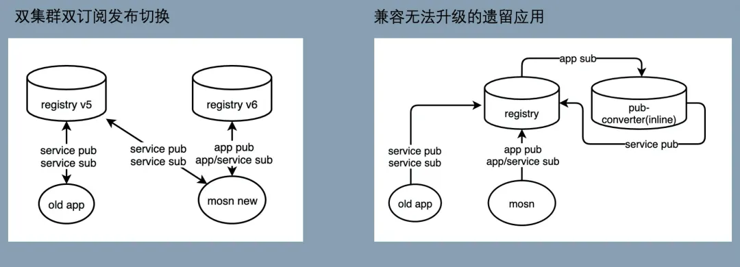 在完成绝大多数应用的应用级迁移后,升级后的应用都已经到了 SOFARegistry 6.0 版本的注册中心上,但仍然存在少量应用因为没有接入 MOSN,这些余留的 old app 也通过域名切换到 SOFARegistry 6.0,继续以接口级订阅发布和注册中心交互。为了确保已升级的和没升级的应用能够互相订阅,做了一些支持: