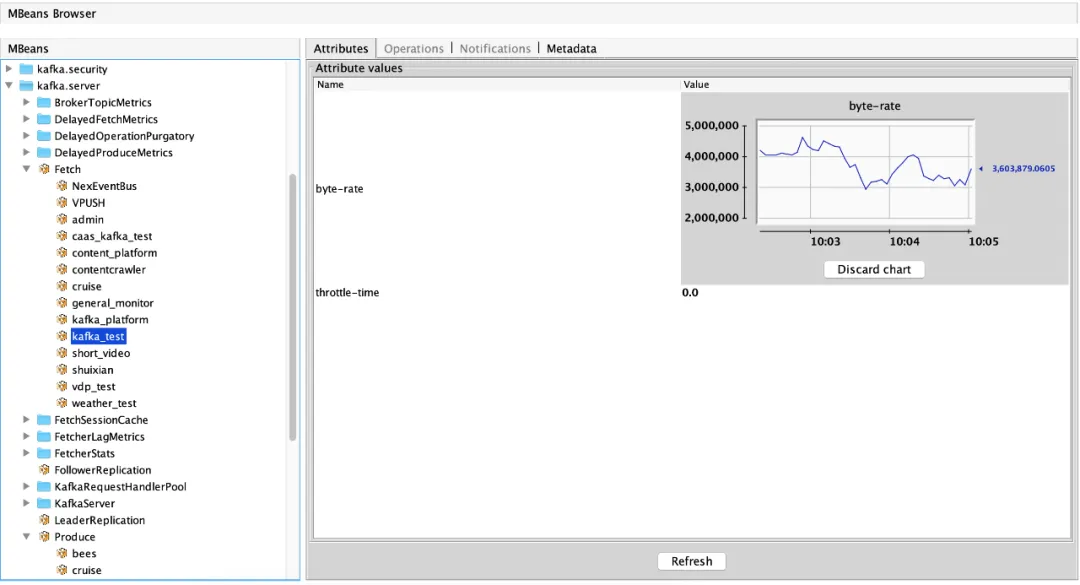 (1)消费流量指标:ObjectName:kafka.server:type=Fetch,user=acl认证用户名称 属性:byte-rate(用户在当前broker的出流量)、throttle-time(用户在当前broker的出流量被限制时间)(2)生产流量指标:ObjectName:kafka.server:type=Produce,user=acl认证用户名称 属性:byte-rate(用户在当前broker的入流量)、throttle-time(用户在当前broker的入流量被限制时间)