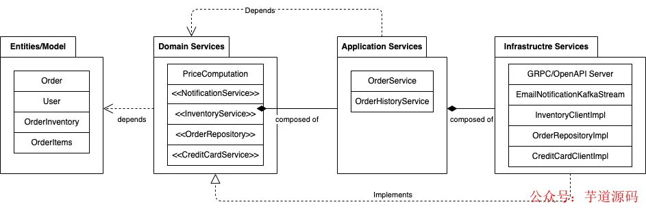 应用服务也被称为“用例”,是只负责协调请求步骤的服务,不应该有任何业务逻辑。应用服务与其他服务交互,以满足客户的请求。让我们考虑一下用例,用一个物品清单创建一个订单。我们首先需要计算价格,包括税收计算/折扣等,保存订单项目并向客户发送订单确认通知。定价计算应该是领域服务的一部分,但涉及定价计算、检查可用性、保存订单和通知用户的协调工作应该是应用服务的一部分。应用服务只能由基础设施服务调用。
