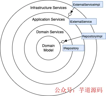 每个层/圈封装或隐藏内部的实现细节,并向外层公开接口。所有的层也需要提供便于内层消费的信息。其目的是最小化层与层之间的耦合,最大化跨层垂直切面内的耦合 。我们在较深的层定义抽象接口,并在最外层提供其具体实现。这样可以确保我们专注于领域模型,而不必过多地担心实现细节。我们还可以使用依赖性注入框架,比如 Spring,在运行时将接口与实现连接起来。例如,领域中使用的存储库和应用服务中使用的外部服务在基础设施层实现。