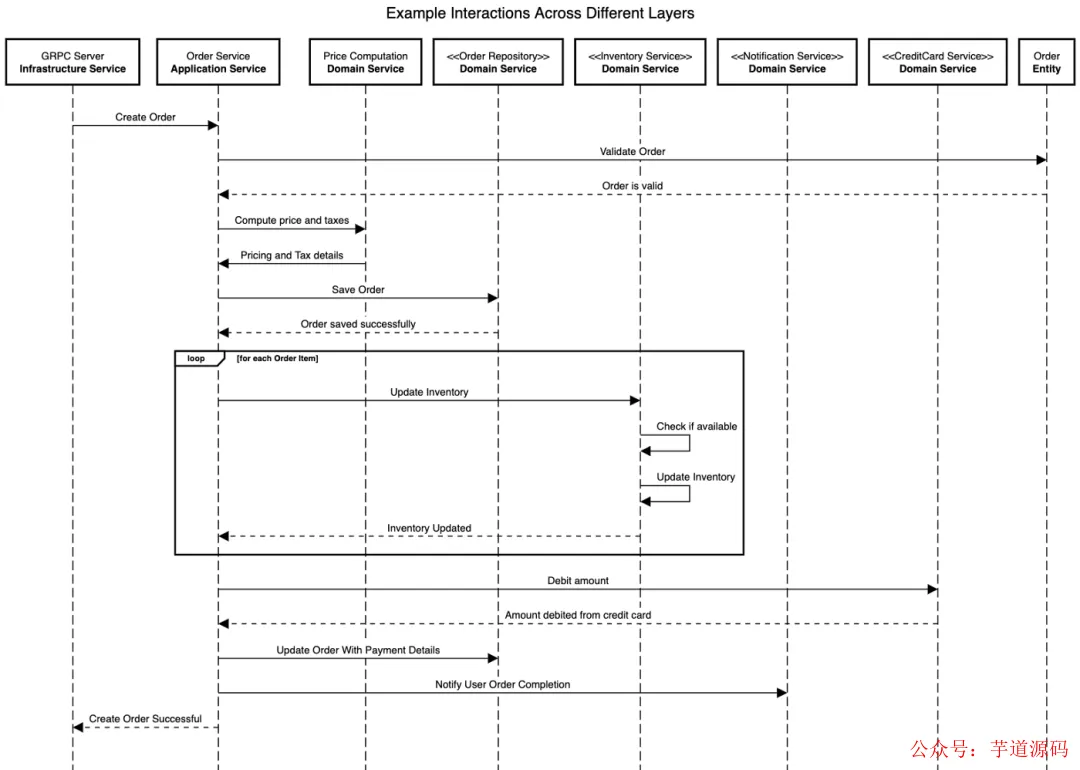 让我们通过一个创建订单的用例来了解架构的不同层和它们的职责。当收到一个创建订单的请求时,我们会对这个订单进行验证,将这个订单保存在数据库中,更新所有订单项目的库存,借记订单金额,最后向客户发送订单完成的通知。