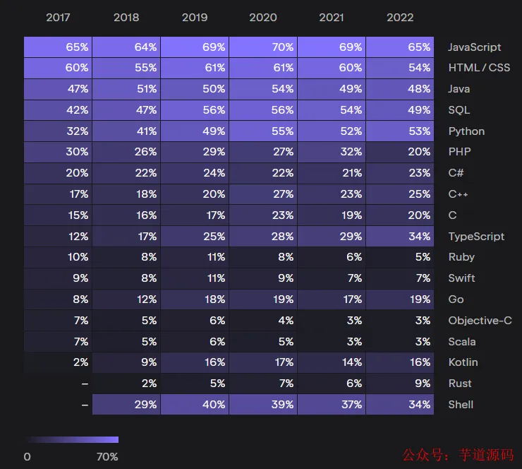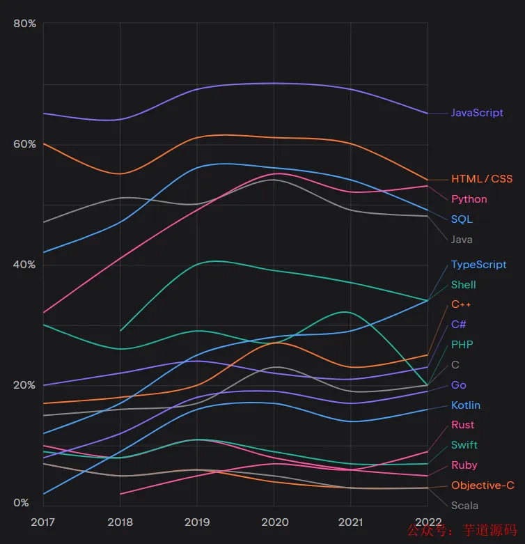 - JavaScript 仍然是最流行的编程语言,尚未被 TypeScript 超越。TypeScript 的使用率在过去 6 年中几乎翻了三倍,从 2017 年的 12% 增加到 2022 年的 34%。