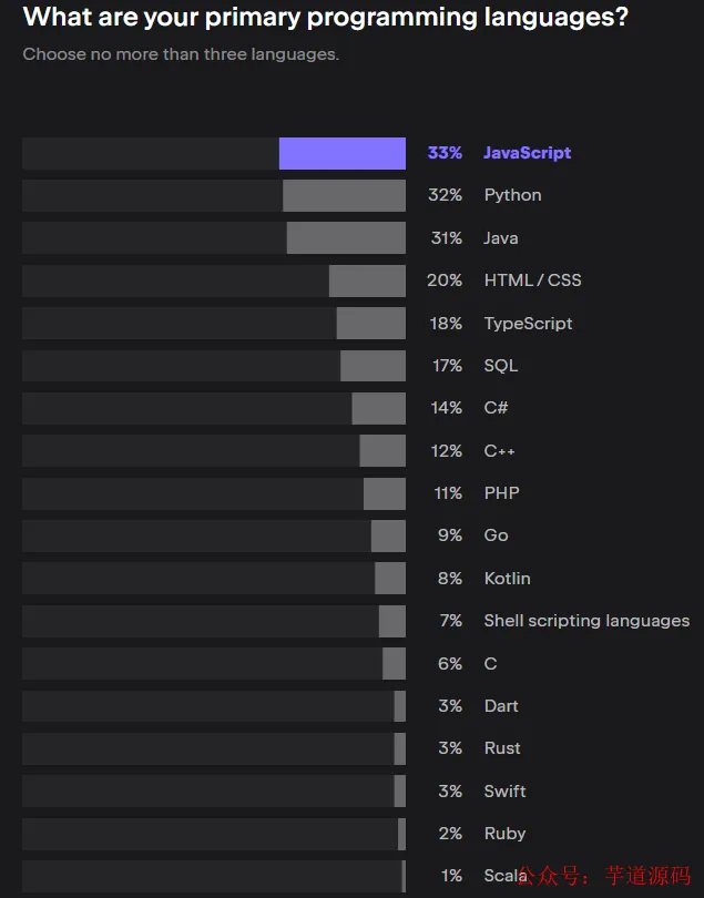 - 最不受喜欢的五种编程语言是 JavaScript、Java、PHP、C 和 C++。但当考虑到相对用户数量时,Perl 的占比高达 96%,其次是 Visual Basic 77%,Delphi 60% 和 C 51%。