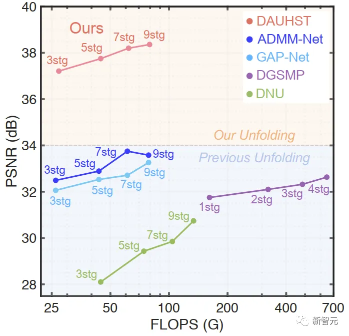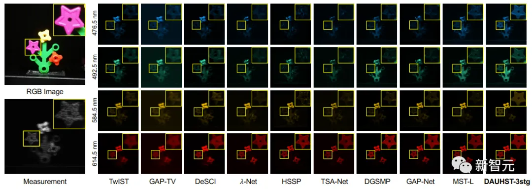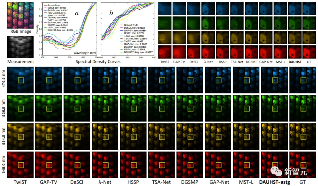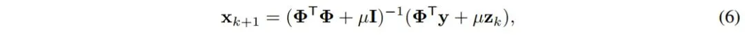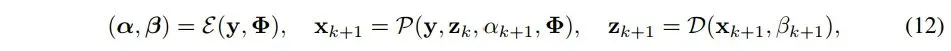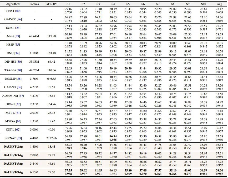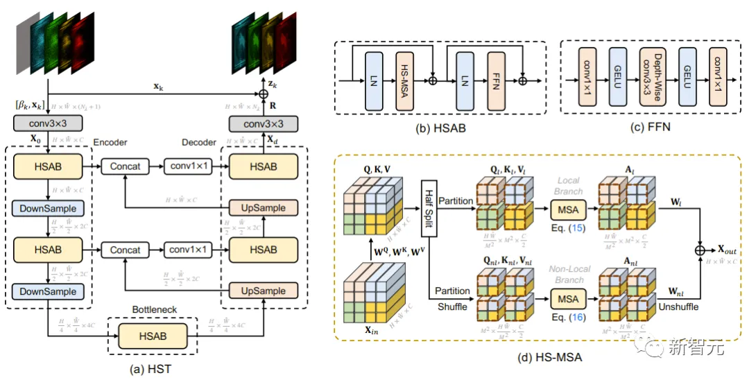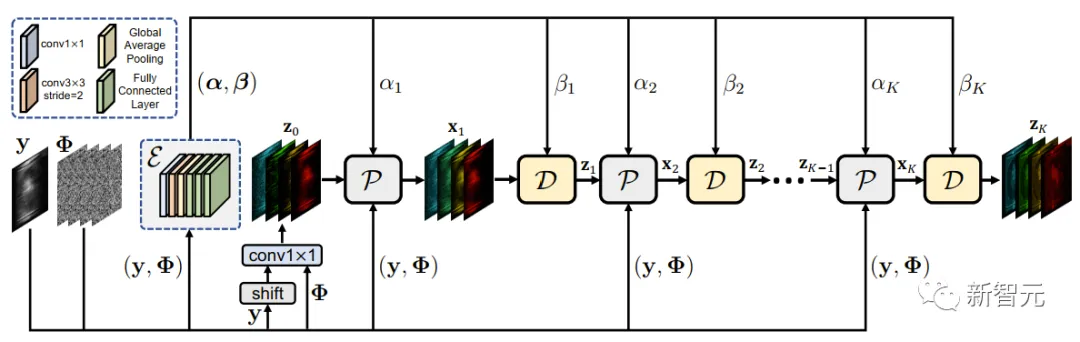 我们首先推导出一个 CASSI 退化模式和病态度可感知的深度展开框架,Degradation-Aware Unfolding Framework (DAUF),如图 2 所示。它以最大后验概率为理论基础来进行推导。结合公式(1),我们可以得到 CASSI 的最大后验概率能量优化函数为:引入辅助变量 z 之后,我们可以得到为了得到展开式的推导,同时使迭代过程更加简单,能够更快地收敛,我们对公式(3)采用 Half-Quadratic Splitting (HQS)算法进行展开,得到:我们对公式(4)中的 x 和 z 进行解耦,从而得到两个迭代的子问题如下:其中的 x 项有一个闭式解:其中 I 是恒等矩阵,上述闭式解涉及到矩阵求逆,对计算机不友好。为简化矩阵求逆运算,我们做了以下推导:将公式(7)插入到公式(6),我们可以得到:请注意,在 CASSI 系统中是一个对角矩阵,定义,由此可得:定义且 表示的第 i 个元素,将公式(9)代入公式(8),可得:返回到迭代公式(5)中,从贝叶斯概率的角度来看,z 项的求解我们可以视为一个去噪问题:我们可以用一个嵌入的神经网络来隐式地求解公式(11)。至此,我们便完成了 x 项与 z 项的迭代求解过程。总的来看,我们的 DAUF 可以用下面这个范式来概括:从左到右依次为参数估计,线性映射,先验去噪。