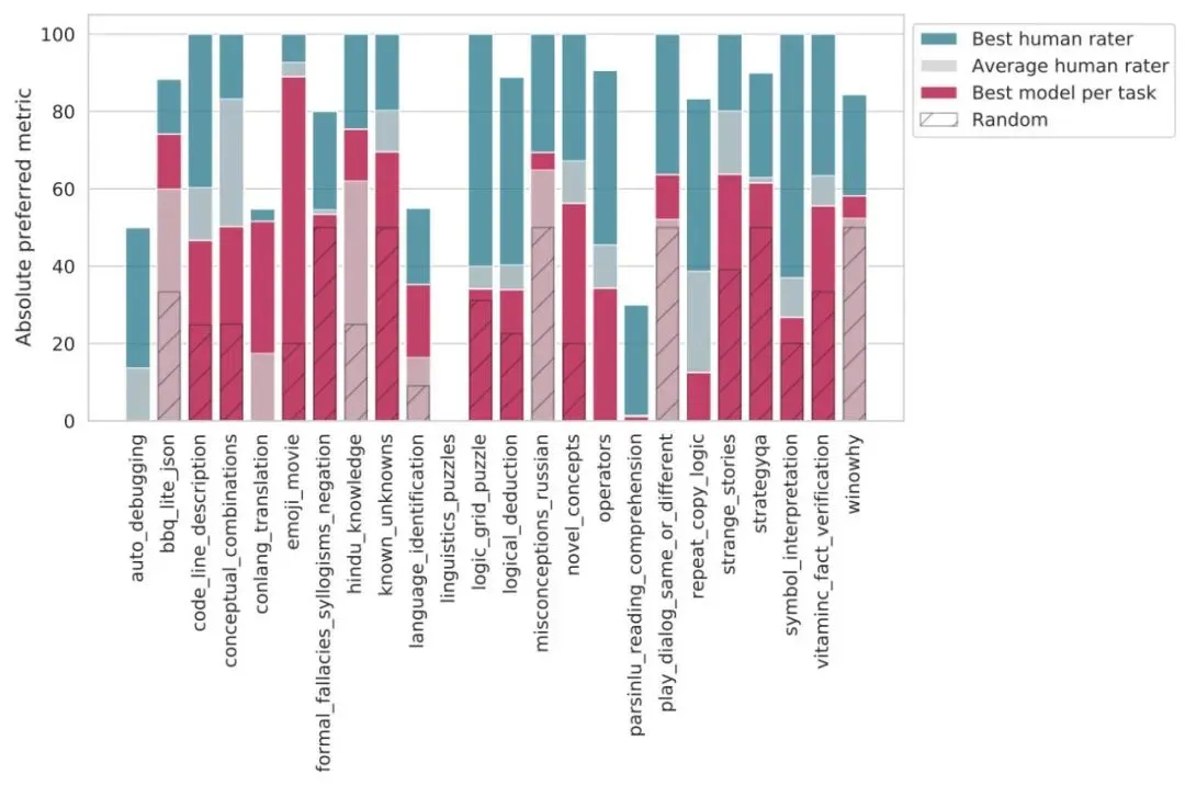 研究人员表示,该工作历经两年努力完成,论文长达 100 页,作者有 442 人,目前 benchmark 包含的任务已经从 PaLM 论文时期的 150 个增加到超过 200 个。