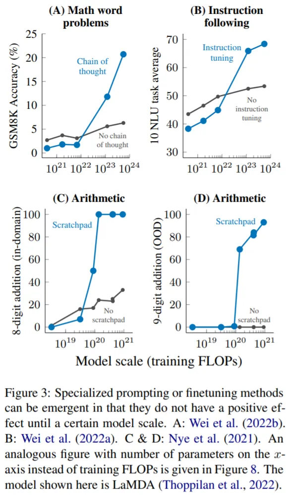 摘要:包括 Jeff Dean 、 Percy Liang 等在内的 16 位研究者合作的论文《 Emergent Abilities of Large Language Models 》,他们讨论了大模型不可预测现象,并称之为大型语言模型的突现能力( emergent abilities)。所谓的突现,即有些现象不存在于较小的模型中但存在于较大的模型中,他们认为模型的这种能力是突现的。