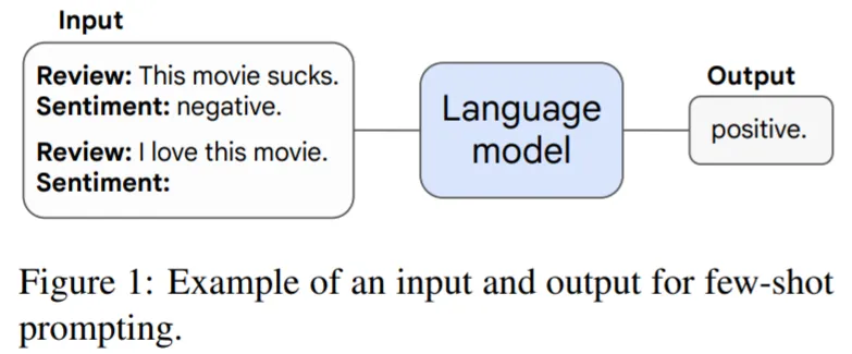 本文首先讨论了提示范式中的突现能力。例如在 GPT-3 提示中,给出预训练语言模型任务提示,模型无需进一步训练或对参数进行梯度更新即可完成响应。此外,Brown 等人提出了小样本提示,他们将模型上下文(输入)中的一些输入输出示例作为提示(preamble),然后要求模型执行未见过的推理任务。图 1 为一个提示示例。