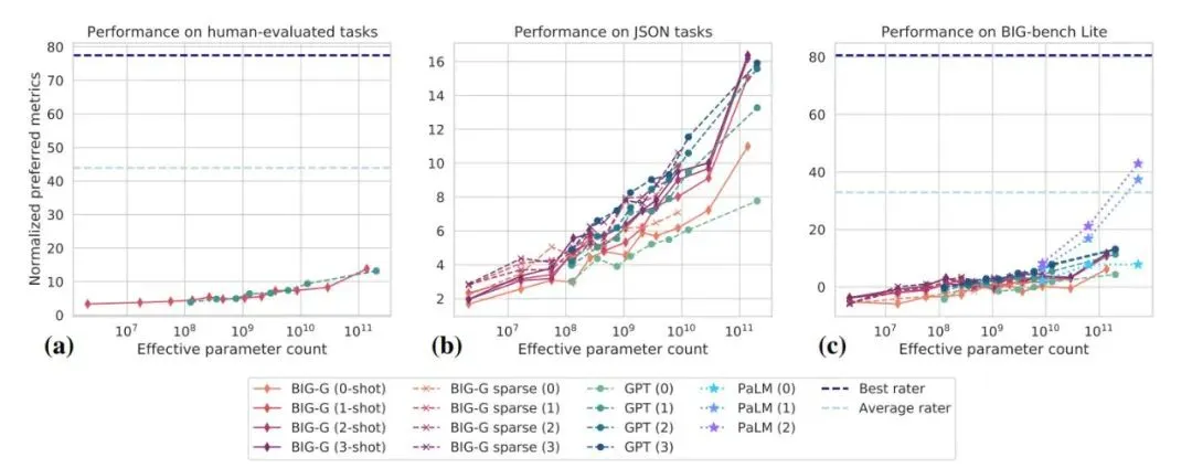 图 1:在 BIG-bench 上,很多模型总体性能随着体量的增加而提高。但目前看来,所有模型在绝对值(absolute term)方面都表现一般。