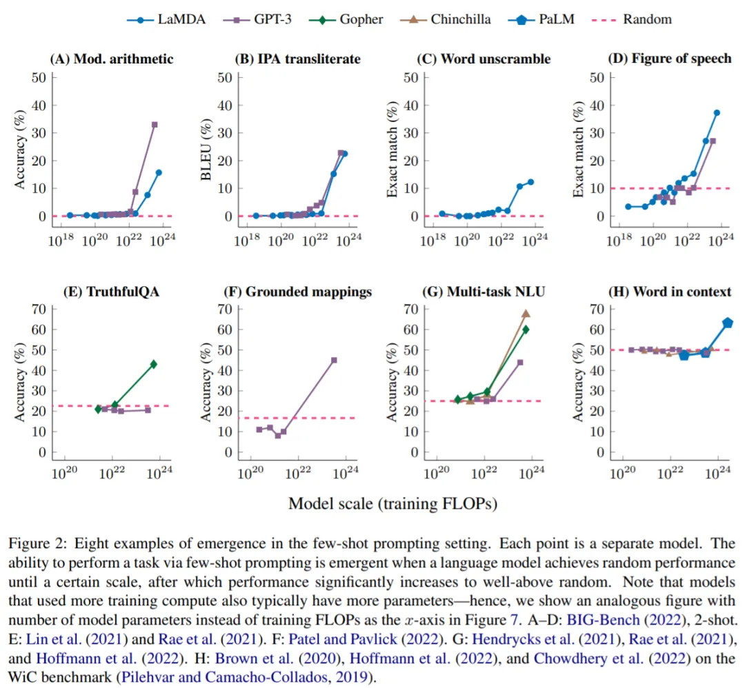 当模型具有随机性能且具有一定规模时,通过小样本提示就可以执行任务,这时突现能力就会出现,之后模型性能远远高于随机性能。下图展示了 5 个语言模型系列(LaMDA、GPT-3、Gopher、Chinchilla 以及 PaLM )的 8 种突现能力。