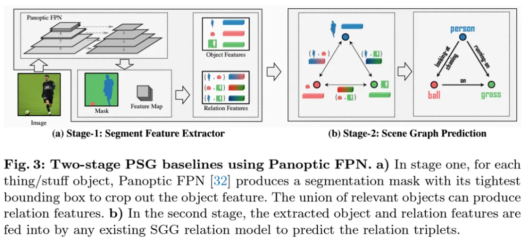 双阶段的方法利用 Panoptic-FPN 在第一阶段中对图像进行全景分割。接下来该研究提取了全景分割得到的物体的特征以及每一对物体融合的关系特征,送至下一阶段的关系预测阶段。框架已集成复现了传统场景图生成的经典方法 IMP,VCTree,Motifs,和 GPSNet。