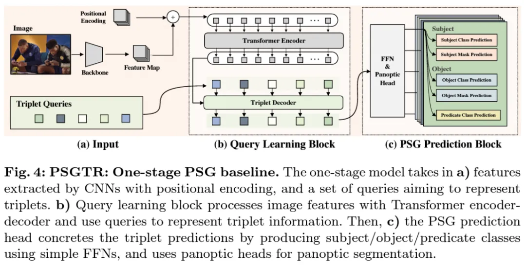 PSGTR 是基于 DETR 的单阶段方法。模型首先在 a)中通过卷积神经网络 backbone 提取图片特征并加以位置编码信息作为编码器的输入,同时初始化一组用以表示三元组的 queries。与 DETR 类似地, 在 b)中模型将编码器的输出作为 key 和 value 与表示三元组的 queries 一同输入解码器进行 cross-attention 操作。随后模型在 c)中将解码完成的每个 query 分别输入主谓宾三元组对应的预测模块,最后得到对应的三元组预测结果。