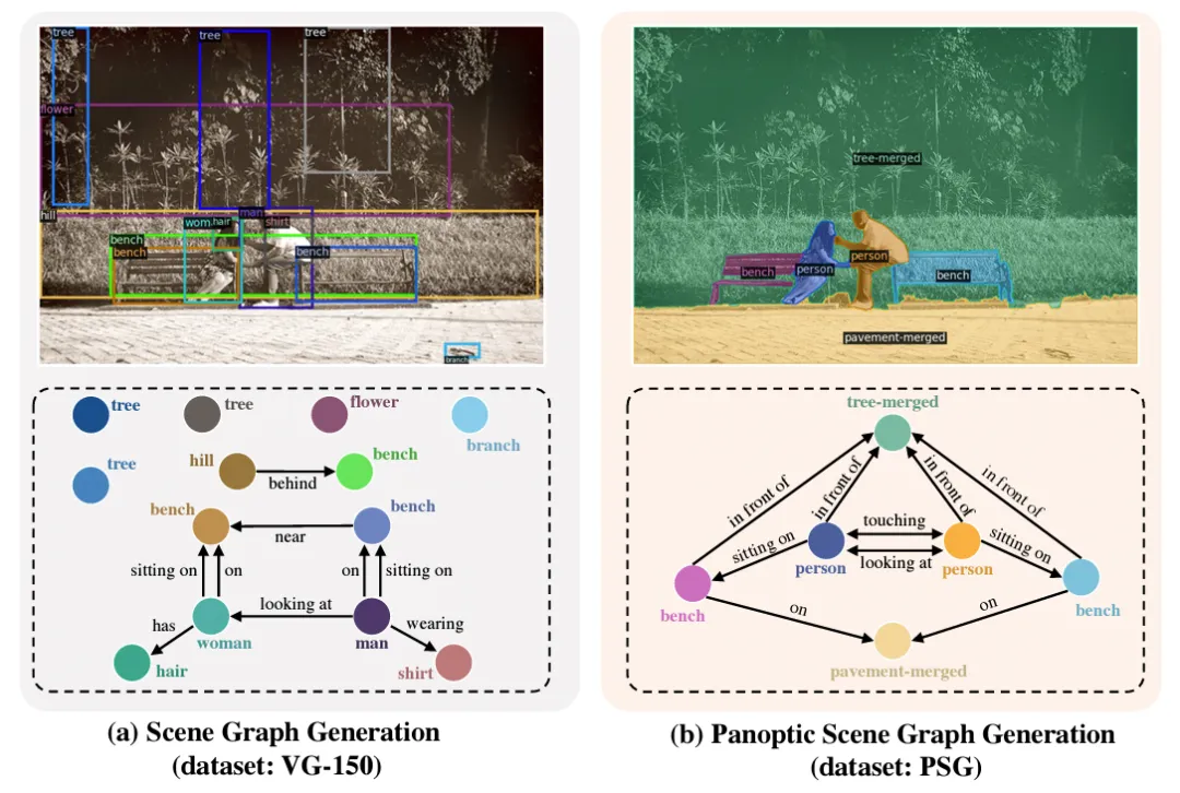 左图来自于 SGG 任务的传统数据集 Visual Genome (VG-150)。可以看到基于检测框的标注通常不准确,而检测框覆盖的像素也不能准确定位物体,尤其是椅子,树木之类的背景。同时,基于检测框的关系标注通常会倾向于的标注一些无聊的关系,如“人有头”,“人穿着衣服”。相比之下,右图中提出的 PSG 任务提供了更全面(包括前景和背景的互动)、更清晰(合适的物体粒度)和更准确(像素级准确)的场景图表示,以推动场景理解领域的发展。