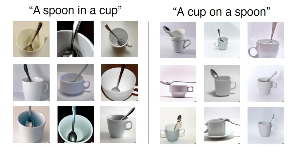 最近大火的基于文字输入的生成模型(如 DALL-E 2) 的画作着实令人惊叹,但是也有研究表明,这些生成模型可能只是把文本中的几个实体粘合在一起,甚至都没有理解文本中表述的空间关系。如下图,虽然输入的是 “杯子在勺子上”,生成的图片仍然都是 “勺子在杯子里”。
