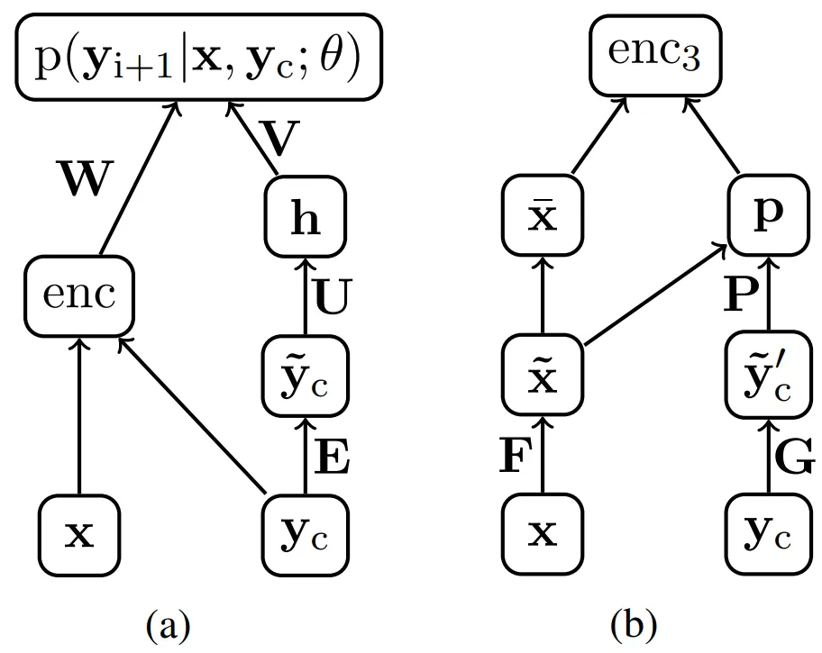 图1. (a) 带有额外编码器的NNLM解码器的网络图。(b) 基于注意力的编码器enc3的网络图