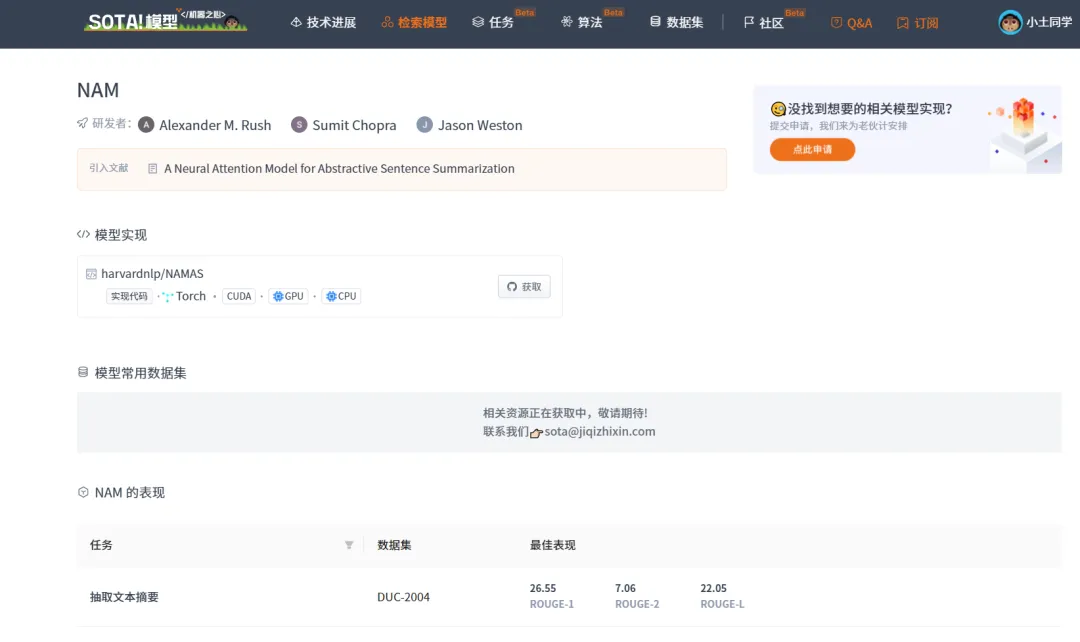 | NAM | https://sota.jiqizhixin.com/models/models/2072950a-5014-41a7-8801-5b894e5bb4a5收录实现数量:1支持框架:Torch | A Neural Attention Model for Abstractive Sentence Summarization |