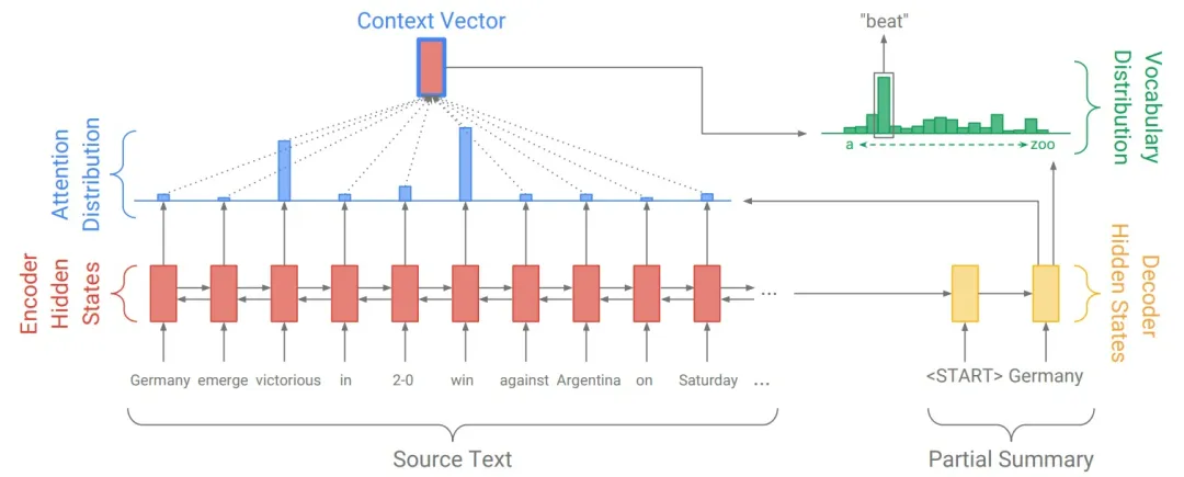 此外,引入Coverage机制解决经典模型的重复性问题。在coverage model中,主要维持coverage vector,是之前所有解码器时间步长的注意力分配总和,也就是某个特定的源词的收敛就是到此刻它所受到 attention 的和: