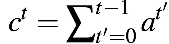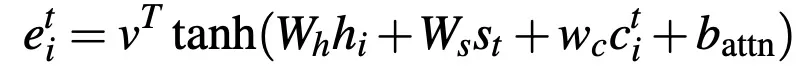 其中,c^t 是对源文本单词的分布,它表示到目前为止这些词从注意力机制接收到的覆盖程度。c_0 是一个零向量,因为在第一个时间步长中,没有覆盖任何源文本。此时,注意力机制为: