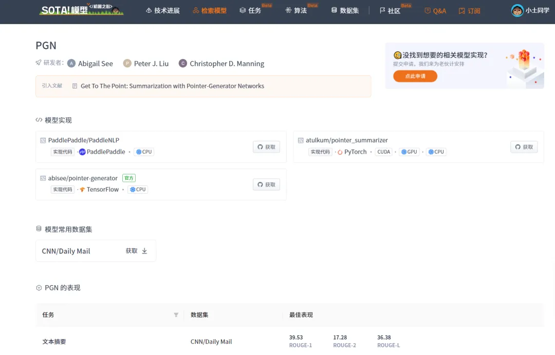 | PGN | https://sota.jiqizhixin.com/models/models/c317f698-b7f3-46d3-abc1-f93c5f5f2b90收录实现数量:3支持框架:PaddlePaddle、TensorFlow、PyTorch | Get To The Point: Summarization with Pointer-Generator Networks |