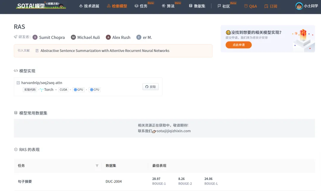 | RAS | https://sota.jiqizhixin.com/models/models/0544ead9-de12-46b0-8fcd-61737f9951af收录实现数量:1支持框架:Torch | Abstractive Sentence Summarization with Attentive Recurrent Neural Networks |