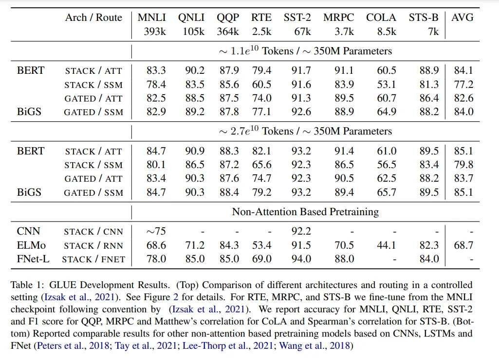 表 1:GLUE 结果。(Top)在控制设置下,不同架构和 routing 的比较。参见图 2 了解详细信息。(Bottom) 报告了基于 CNN、LSTM 和 FNet 的其他非注意力预训练模型的可比结果。