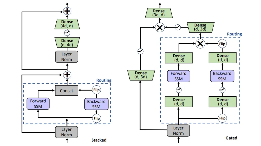 具有自注意力的堆叠架构相当于 BERT /transformer 模型,门控架构是门控单元的双向改编,最近也被用于单向 SSM。带有乘法门控的 2 个序列块(即前向和后向 SSM)夹在前馈层中。为了进行公平比较,门控架构的大小保持与堆叠架构相当。