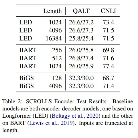 表 2:SCROLLS Encoder 测试结果。基线模型都是编码器 —— 解码器模型,一个基于 Longformer (LED),另一个基于 BART。输入的长度有截断。