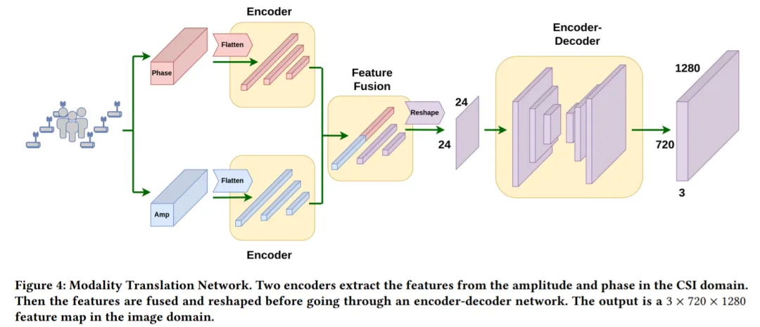 为了从一维 CSI 信号中估计出空间域中的 UV 映射,首先需要将网络输入从 CSI 域转换到空间域。本文采用 Modality Translation Network 完成(如图 4)。经过一番操作,就可以得到由 WiFi 信号生成的图像域中的 3×720×1280 场景表示。