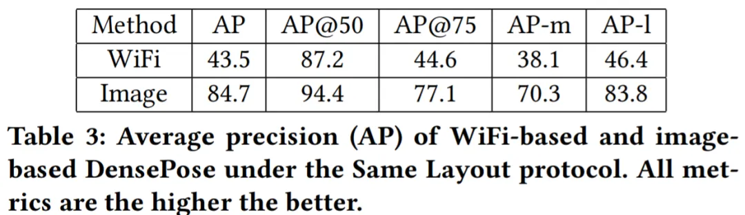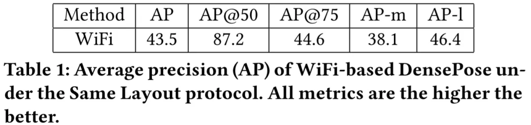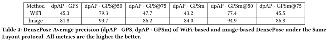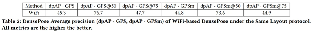 表 1 结果显示,基于 WiFi 的方法得到了很高的 AP@50 值,为 87.2,这表明该模型可以有效地检测出人体 bounding boxes 的大致位置。AP@75 相对较低,值为 35.6,这表明人体细节没有得到完美估计。