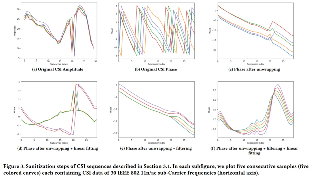 原始 CSI 样本带有噪声(见图 3 (b)),不仅如此,大多数基于 WiFi 的解决方案都忽略了 CSI 信号相位,而专注于信号的幅度(见图 3 (a))。然而丢弃相位信息会对模型性能产生负面影响。因此,该研究执行清理(sanitization)处理以获得稳定的相位值,从而更好的利用 CSI 信息。
