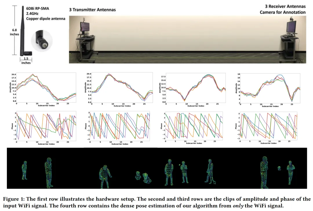 研究者想要解决的问题如下图 1 第一行所示。给定 3 个 WiFi 发射器和 3 个对应的接收器,能否在多人的杂乱环境中检测和复原密集人体姿态对应关系(图 1 第四行)?需要注意的是,很多 WiFi 路由器(如 TP-Link AC1750)都有 3 根天线,因此本文方法中只需要 2 个这样的路由器。每个路由器的价格大约是 30 美元,意味着整个设置依然比 LiDAR 和雷达系统便宜得多。