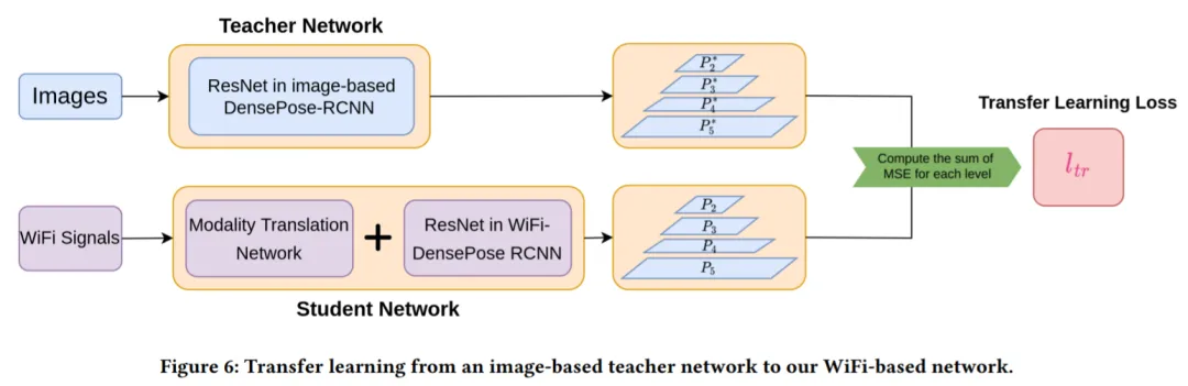 然而从随机初始化训练 Modality Translation Network 和 WiFi-DensePose RCNN 网络需要大量时间(大约 80 小时)。为了提高训练效率,该研究将一个基于图像的 DensPose 网络迁移到基于 WiFi 的网络中(详见图 6)。