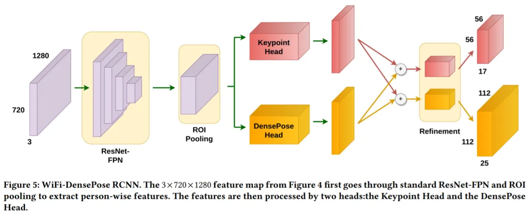 在图像域中获得 3×720×1280 场景表示后,该研究采用类似于 DensePose-RCNN 的网络架构 WiFi-DensePose RCNN 来预测人体 UV 图。具体而言,在 WiFi-DensePose RCNN(图 5)中,该研究使用 ResNet-FPN 作为主干,并从获得的 3 × 720 × 1280 图像特征图中提取空间特征。然后将输出输送到区域提议网络。为了更好地利用不同来源的互补信息,WiFi-DensePose RCNN 还包含两个分支,DensePose head 和 Keypoint head,之后处理结果被合并输入到 refinement 单元。