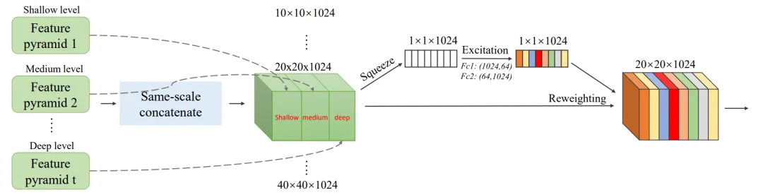 SFAM聚合TUMs生成的多级多尺度特征,以构造一个多级特征金字塔。第一步,SFAM沿着通道channel维度将拥有相同scale的feature map进行拼接,这样得到的每个尺度的特征都包含了多个level的信息。第二步,加入channel-wise attention,以更好地捕捉有用的特征。SFAM的细节如下图所示: