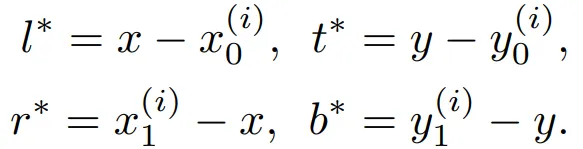 对于特征图F_i中的任意位置(x, y),可以将其推回到该层特征图的输入特征图的位置 ( ⌊ s /2 ⌋ + x s , ⌊ s /2 ⌋ + y s ) 。本文提出的检测器直接回归每个位置上的目标的bbox,也就是将每个像素位置看做一个训练样本,而非将每个 anchor box 看做训练样本。如果某个像素位置落入真实的 bbox 内,而且类别和真实的类别相同,则定义为正样本,否则判定其为负样本,且类别为 0 (background class)。t^* = (l^* , t^* , r^* , b^* ) 是每个像素位置(sample)所要回归的目标,分别表示从 sample 的位置到 bbox 的四个边的距离,如图 28 左侧所示。当一个点同时落入多个框的时候,被认为是 “ambiguous sample”,也就是 “模棱两可” 的框,选择最小面积的框作为回归目标。如果一个像素位置 (x, y) 和 bounding box B_i是相关的,则训练时的回归目标可以被格式化为如下形式: