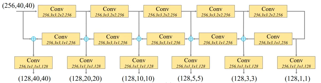 TUM使用了比FPN和RetinaNet更薄的U型网络。在上采样和元素相加操作之后加上1x1卷积来加强学习能力和保持特征平滑度。TUM中每个解码器的输出共同构成了该TUM的multi-scale输出。每个TUM的输出共同构成了multi-level&multi-scale特征,前面的TUM提供low level feature,后面的TUM提供high level feature。计算如下: