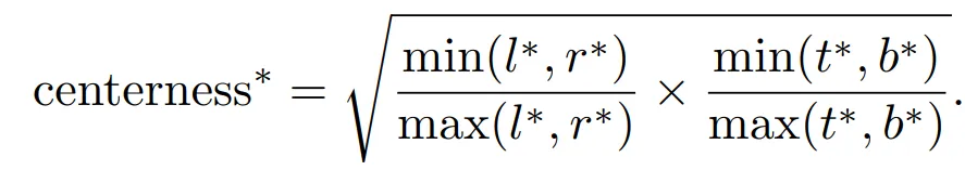 虽然使用 FPN 可以弥补不同尺度目标的识别问题,但 FCOS 还是和 anchor-based 方法的效果有一定的差距。主要原因在于,预测生成了很多距离目标中心点很远的低质量 bbox。作者在原来的两个 branch 的基础上,添加了一个 centerness 分支,来预测每个位置的 “centerness”,即该位置和真实目标中心点的位置。Centerness 是给所有判定为正样本的样本点来计算的,判定为负样本的样本点是不会被计算 Centerness 的,可以看做是对所有的正样本,按其距离 gt 中心点的距离来设置权重,距离越近,则质量越高,权重越大,越有可能被 NMS 排序的时候排到前面。下面的公式展示了 centerness 真值的计算方法,loss 使用的是二值交叉熵损失函数。